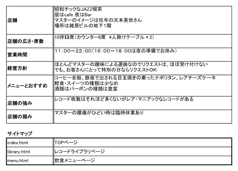 落ち着いた店内の空気感や、レコードが流れるゆっくりした時間をWeb 上でも感じてもらえるようにHTML / CSS で1ページずつ丁寧にコーディング しました。